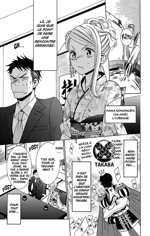 On pourrait trouver cela étrange qu’un mariage arrangé puisse se faire entre une adolescente de 16 ans et un homme de 26 ans. 10 ans de différence à cette là est assez importante mais pas dans les mangas. Surtout que 16 ans pour une fille est la période des changements hormonaux, de la découverte de son corps, de l’ouverture au monde qui l’entoure… C’est ce qui explique le comportement excessif d’Hana. Yuki Shiwasu joue aussi avec la différence de statut social. Lui essaie de l’épater avec des restaurants étoilés, des vêtements de marque et elle les plaisirs simples comme le bowling, le cinéma, les truffes au chocolat… Deux mondes se rencontrent et essaient de s’apprivoiser. Qu’est-ce que cela va donner au final? Pour l’instant rien n’est certain surtout qu’un adolescent à faire du gringue à Hana. Va t’elle devoir choisir entre un garçon de 16 et de 26 ans? Faut-elle qu’elle pense au mariage? Les gags à répétition ne risquent pas de s’arrêter en si bon chemin.