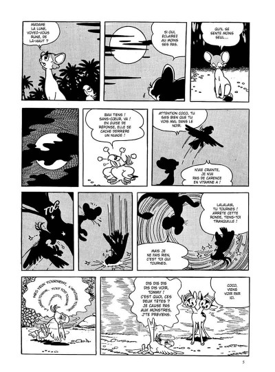 Osamu Tezuka devait avoir une part d’illusion assez importante quand il a dessiné « Le roi Léo ». Penser qu’il est possible de créer des liens sincères entre des animaux et des hommes semblent utopique, encore maintenant. Surtout lorsqu’on sait que des espèces disparaissent chaque jour à cause de l’urbanisme grandissant et de la chasse. On tue encore des éléphants pour leur corne pour des soucis d’érection et on tue des lions ou tigres pour décorer un salon. Le petit lion René s’est fait capturé pour être exposé comme singe savant dans un zoo. Face à l’argent, la vie des animaux n’a aucune valeur. L’idéal du scénariste allait jusqu’à la création de viande pour éviter que les animaux se mangent entre eux. Etonnant qu’il n’a pas pensé à créer de la viande pour éviter que les humains les mangent. Les hommes ne sont pas totalement épargnés pour cause de leur avidité et leur cruauté puisque deux pays fictifs A et B s’affrontent pour une découverte. On trouve même à une référence à Rommel, un homme terrible (et encore adulé), la fin de la guerre n’est pas encore si loin dans l’esprit. Mais l’artiste clôture son histoire sur le roi qui se sacrifie pour sauver un homme afin qu’il puisse le manger et avoir chaud avec sa fourrure. Je trouve cela assez horrible qu’il choisisse d’abandonner toute une nation et sa famille pour quelques papiers et un humain qui ne servent à rien. Une morale assez triste au final qui ne me donne pas du tout envie de chanter « Hakuna Matata ».