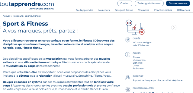 Sur la plaforme Toutapprendre vous pouvez choisir entre différent sport et niveau ce qui permet que vous ayez de l’embonpoint ou que vous soyez très musclés, vous trouverez votre bonheur. Surtout que vous pourrez alterner avec des séances de yoga ou de méditation.