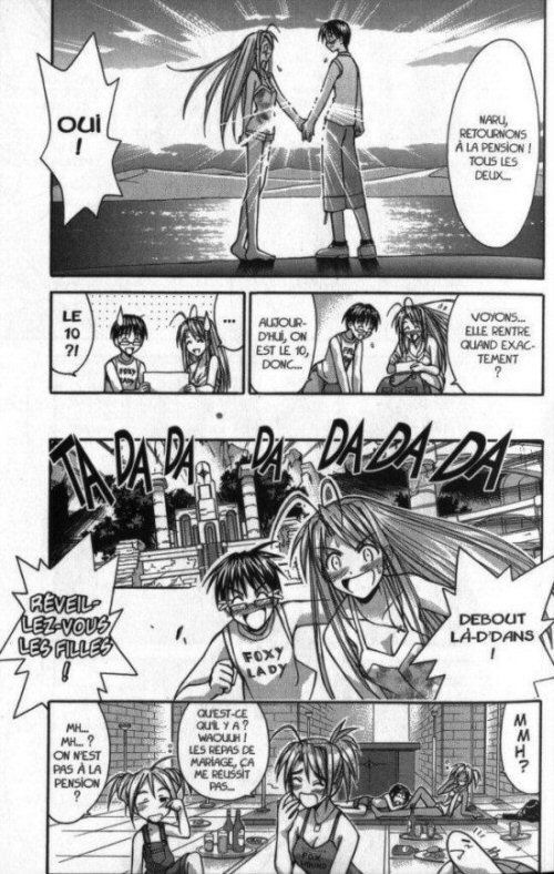 A la couverture, vous saviez déjà que nos amoureux allait finir par se marier en grande pompe. Il restait à savoir comment ils allaient en arriver là. J’espérais une lecture pleine de rebondissements avec une belle déclaration d’amour entre Keitarô et Naru. Mais même s’ils arrivent de très nombreuses péripéties, le scénariste a décidé de consacrer beaucoup de temps sur Naru. Mais pas Naru heureuse qui veut mettre fin à ces hésitations de pré-adolescente. Non, encore une Naru qui n’arrête pas de se plaindre, de lambiner, de faire du boudin, de chougnier, de pleurnicher… Bref, une envie de lui en mettre une se fait grandement ressentir tellement elle est insupportable. Il a beau lui dire qu’il l’aime, elle se pose 1001 questions débiles et inutiles pour finir pour rompre. Keitarô fait encore le nécessaire malgré les coups qu’il prend pour tenter de la convaincre. Heureusement que la grand-mère débarque et change la donne. Enfin, on peut passer à autre chose. Il faut attendre l’épilogue pour avoir un mariage en grande pompe ce qui semble assez précipiter au vue des circonstances précédentes. Ken Akamatsu n’a t’il pas eu assez d’argent ou d’inspiration pour faire une fin plus positive? Bref, nos héros auront enfin une bonne raison de faire l’amour ou de tenter en tout cas. Mais cela ne nous regarde plus car enfin la série est terminée et que Naru va rester à jamais entre les pages de ce tome pour ne jamais se réveiller à nouveau.