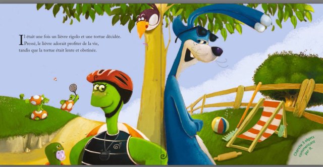 Tout le monde le sait que le lièvre est plus rapide que la tortue. « Un jour, un renard sportif proposa au lièvre d’organiser une course avec la tortue, en promettant une belle récompense. » Le gagnant aura une surprise tous les jours et cette perspective ravie la tortue qui a 5 enfants. Les deux parties acceptent le défi. Prêt, partez…. Le lièvre sait qu’il ne lui faut pas beaucoup de temps pour arriver sur la ligne d’arrivée alors il va en profiter pour aller au cinéma, danser avec ces amis et jouer au ballon avec les écureuils. Pendant ce temps, la tortue avance doucement et même surement. C’est quand le lièvre se réveille de sa sieste devant la ligne d’arrivé qu’il voit la tortue passée en premier. Impossible… se dit-il. « Et bien! lança la tortue à son concurrent dépité. Qu’est-ce que se serait si vous aviez en plus votre terrier sur votre dos? A quoi vous sert votre vitesse? Rien ne sert de courir, il faut partir à point! »