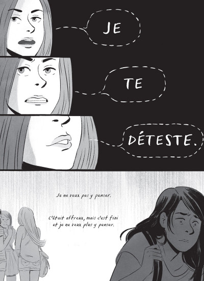 Laure Halse Anderson a écrit une histoire sur une adolescente qui a été violé dans les années 90. A sa grande surprise, le livre a été un vrai succès et dans le monde entier. A tel point qu’il est adapté en comics en 2019 par Emily Carroll. Le viol ne doit pas être un sujet tabou car ils concernent tellement de gens. Un traumatisme qui change à jamais la vision que l’on peut avoir de sa personne et de ceux qui nous entoure. Impossible de ne pas être touché par Mélinda qui souffre en silence jusqu’à se noyer à l’intérieur d’elle-même. Un ouvrage qui permet à des victimes de pouvoir s’identifier, à se sentir moins seules. Et qui s’adresse aussi aux autres afin de faire attention aux paroles ou aux silences de ceux qui nous entoure. La dessinatrice trouve le bon équilibre dans le noir et blanc pour nous prendre par les sentiments. Elle ne s’autorise jamais de faire des choses pour tomber dans l’excès. La vraisemblance avant tout. On suit l’adolescente de 15 ans dans ces réflexions, son rapport à son corps et à ceux qui l’entoure. Un cheminement assez long dans les tréfonds des ressentis et des émotions. Elle se libère grâce à un formidable et puissant NON. Un mot qui sort et qui change tout. La parole modifie tout et permet d’avancer. Comment ne pas avoir envie de partager ce livre aussi bien à des femmes bien entendu, mais aussi à des hommes. C’est en échangeant sur des sujets dit tabous que l’on pourra espérer des lendemains plus tolérants.