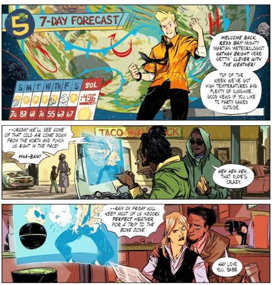 Comme d’habitude chez Urban Comics, on trouve de bonnes surprises. Impossible de résister à une telle couverture en couleurs explosives avec cet homme météo à la tête toute bizarre. Dès les premières pages, on est emporté. Ce gars qui a tout de plus ordinaire est peut-être la clé qui sauvera le monde. Comment? Voilà que débute l’action qui va nous pousser à continuer l’histoire. Quête d’identité, criminels sauvages et sans pitié, courses de voitures et de navettes spatiales, combats dans le réel et le virtuel, cadavres, expériences scientifiques… tout s’enchaîne à grande vitesse sans que vous vous en rendiez compte. Et quand enfin vous êtes pris dans le tourbillon, vous venez d’arriver à la fin. Déjà? Vous ne voulez pas rester sur votre faim et connaître la vérité. Qui est le coupable des milliard de morts? Homme seul, équipe rebelle ou stratégie de politique? Qu’elle est le vrai rôle de Nathan Bright? Scénariste, dessinateur et coloriste ont tous trouvé le juste milieu et le parfait équilibre pour captiver l’attention du lecteur. Une fois que l’on a mordu à l’hameçon on veut lire toute la série qui est en trois tomes. Pour l’instant, juste deux tomes ont été publiés. Quelque chose me dit que le tome 2 ne va pas tarder à être dévoré. Que va nous réserver la suite?