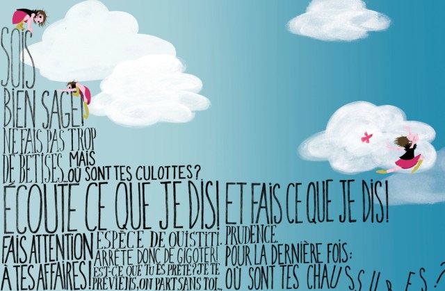 Charlotte Gastaut nous propose un livre vraiment magnifique. Dès que j’ai vu la couverture, je me le suis achetée. Il impressionne déjà par son grand format et aussi par le choix de couleurs entre verts, bleus et le rose fluo. On voit une petite fille qui nous semble rebelle. Elle ne se tient pas droite, on voit son nombril et porte des chaussettes trop grandes. Aucun doute que l’enfant va vivre quelque chose d’improbable. Et cela va être le cas dès la première page. Les mots prononcés par la mère impatiente envahissent les pages. Ils recouvrent tout et la fillette devient toute petite. Puis petit à petit, elle passe au dessus au sens propre comme au sens figuré. Puis la voilà dans les nuages accompagnée d’un petit oiseau à la tête sympathique. Le côté merveilleux n’apparaît pas uniquement dans le sublime rendu graphique. Il se trouve également dans la mise en page avec des jeux de découpe du papier et aussi les délicats jeux de transparences des papiers calques. Le rendu est magique et le lecteur est pris par la main pour lui aussi rêver. On prend son temps pour tourner les pages et regarder les détails de chaque décors. Chaque double page devient un voyage contemplatif communiquant avec notre âme d’enfant. Au final, on garde le livre pour soi comme une esquisse d’un moment fabuleux que l’on apprécie retrouver en toute intimité.