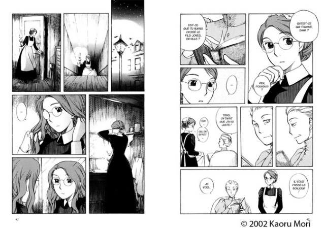 autre univers, celle de la société anglaise du 19ème. Une société qui change avec de nouveaux riches qui rivalisent avec les aristocrates. Mais le quotidien change t’il vraiment pour le reste de la population ? Un mélange des castes est-elle possible ? Dans un monde idéal surement mais dans la réalité c’est plus difficile. Les pères de famille veulent préserver leur pécule et faire en sorte de le fructifier. Là-dedans, il n’est nullement question de sentiments. C’est à ça que servent les amant(e)s et prostitués. Mais la scénariste veut y mettre de la beauté et de tendresse. William et Emma s’aiment au premier regard. Il faut prendre un peu de temps pour faire connaissance. Le temps c’est de l’argent pour le père de William alors il doit faire au mieux pour arranger les fiançailles. William a-t-il la possibilité de refuser ? quitte à perdre tous ces biens ? Emma pourrait-elle accepter qu’il abandonne tout pour elle ? pourrait-il le faire ? L’ami indien de William serait prêt à l’épouser, sans concession. Une incursion de l’étranger, chère à Kaoru Mori, qui montre l’essor d’un nouveau pays l’Inde. La présence de la Grande-Bretagne dans de nombreux pays permet l’essor d’un nouveau commerce et d’imposer une culture. La présence de ce personnage n’est pas là par hasard. Est-ce la clé qui va créer un rebondissement ?