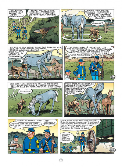 Le petit plus sont les références historiques autour des animaux. En effet, il y avait des animaux qui tenaient compagnie à des soldats que cela soit des chevaux, des poules ou des chiens. Le titre « Sallie » fait référence à une vraie chienne, morte au combat à Gettysburg et qui a eu le droit d’avoir une statut érigée à son nom. Mais est-ce suffisant à donner une plus-value à cette bd ? Sans aucun doute, non. On trouve toujours cette dénonciation de la sauvagerie de la guerre, des morts inutiles, des chefs qui osent sans réfléchir car ce n’est pas leur vie en danger. Toutefois cela me confirme que je ne vais pas poursuivre l’aventure avec ces deux anti-héros même si le scénariste et dessinateur ont maintenant changé. C’est un peu comme les aventures d’Astérix, il faut rester sur ces vieux souvenirs pour ne pas être déçu des nouvelles versions.