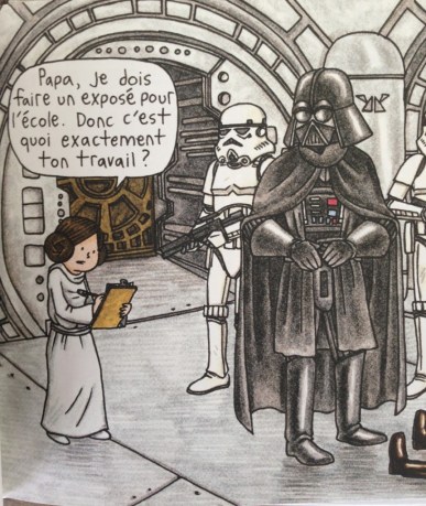 Après avoir fait une bd avec Vador et son fils, Jeffrey Brown fait la suite avec sa fille. Depuis son imagination se poursuit avec d’autres éléments de la saga. Les blagues en une seule ou deux pages sont efficaces surtout pour le fan de Star Wars qui va apprécier les absurdes détournements parodiques. Le dessinateur propose un visuel assez naïf aux traits simples et au coloriage laissant apparaître les marques de crayons. Nous sommes loin de l’image de synthèse des dernières créations Disney. Le décalage est assumé et apparemment le succès est au rendez-vous. Un cadeau idéal à offrir à un papa fan de « Je suis ton père » et qu’elle que soit son pays d’origine. Il finira toujours par trouver des situations qui lui rappelleront quelque chose même s’il n’a pas de robot sous la main.