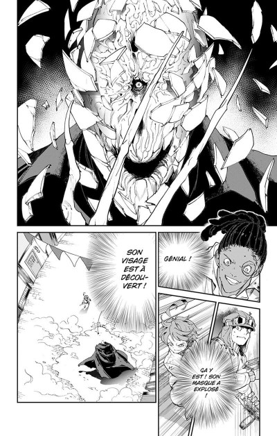 Le plan initial pour tuer Leuvis vient d’être remis en question. Toutes les ressources n’ont pu être mobilisé pour le plan final. Est-ce la fin ? Absolument pas surtout que deux gros atouts viennent changer la donne : monsieur l’inconnu et Ray. Deux fins stratèges qui savent se servir d’une arme à feu et de leur tête. L’observation leur permet de tirer une conclusion Leuvis ne peut pas se régénérer tout le temps. Il faut l’affaiblir au maximum donc ils vont vider des chargeurs sur lui pour l’affaiblir. On rajouter une bombe aveuglante. Maintenant il faut lui exploser son masque et exploser son œil vital. Un travail de longue haleine et d’équipe qui aboutit à une réussite. Mais Emma est gravement touchée, va-t-elle s’en sortir ? Il faut prendre une décision sur la suite des évènements. Partir tous ensemble, détruire Goldy Pound et après sauver tous les enfants des fermes pour retourner chez les humains. Un programme ambitieux toutefois est-ce bien réaliste ? Ne faut-il pas mieux mourir en essayant d’être libre que mourir jeune et en plat pour extraterrestre ?