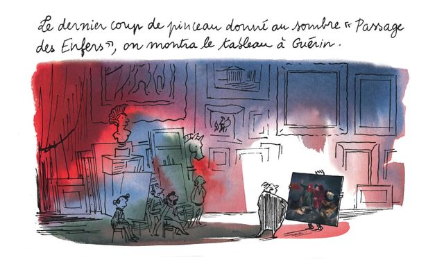Elle a conservé le texte manuscrit de sa belle écriture. Entre les lignes parfois petites illustrations, très dix-neuvièmistes, comme on pouvait en trouver dans la presse de l’époque. Et sur une page entière ou en double page, une interprétation tout en couleur des œuvres du peintre. Elle ne cherche pas à reproduire tel un copiste. Après tout, sa différence à lui se montrait dans la couleur alors pourquoi ne pas lui rendre hommage à travers ça. Les quelques esquisses comme on peut voir sur la couverture permettent de voir les œuvres. Catherine Meurisse conserve son style graphique qui est une sorte de mélange entre Sempé et Claire Bretécher. Tout comme sa folie personnelle qui donne ce côté à la fois singulier, intriguant et captivant.