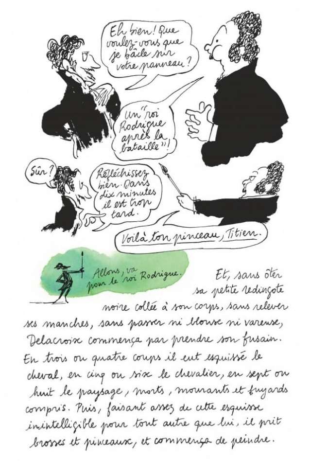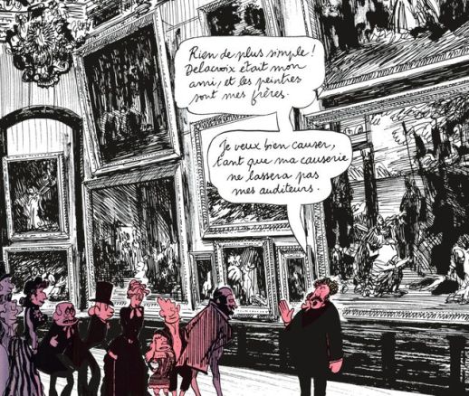 L’art, elle adore ça. Catherine Meurisse après avoir nous avoir fait passer au-dessus du « Pont des arts » en 2012 avec Paul Cézanne, Pablo Picasso, Emile Zola… Puis la « Moderne Olympia » en 2014 avec la fameuse Olympia d’Edouard Manet. Elle reprend ces pinceaux pour nous emmener à la rencontre d’Eugène Delacroix. Pas à travers son regard d’illustratrice mais en prenant un hommage écrit rendu par Alexandre Dumas. Un discours que l’auteur a lu face à un public avec autour d’eux les œuvres du peintre tant aimé. Un premier travaille avait débuté en 2005 publié chez Drozophile fait dans le cadre de son diplôme des Arts Déco. Le temps passe et l’expérience aussi devient plus importante. L’attraction pour les peintres romantiques comme Delacroix ne l’a jamais quitté. Maintenant, elle a eu le temps de voir les œuvres en vrai et elle peut en donner une autre version, plus riche, plus complète et surtout plus colorée.