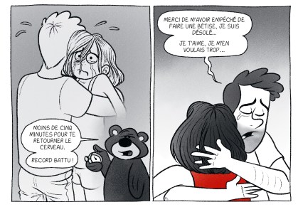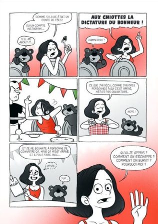 Pour sa première bd, Sophie Lambda a choisi de partager une expérience vécue. Elle a aimé un manipulateur narcissique. On parle depuis peu de ces êtres qui aiment manipuler aussi bien en amour qu’au travail et qui font souffrir. Les ouvrages et les articles aussi bien dans la presse généraliste que spécialiste pullulent. Cette souffrance existe vraiment et elle porte plusieurs noms. Sophie a aimé, trop vite, trop fort un homme qui lui s’aimait vraiment beaucoup trop. Elle raconte avec beaucoup d’humour cette aventure très douloureuse. D’ailleurs, l’histoire elle est racontée en binôme avec son ours en peluche alcoolique. Une distanciation qui permet d’avoir un autre regard, moins dans l’émotion. Une façon de montrer qu’une partie de l’enfant naïf, innocent en soi a disparu. Un peu comme si c’était l’esprit qui échangeait avec le cœur. Souci de perception des évènements.