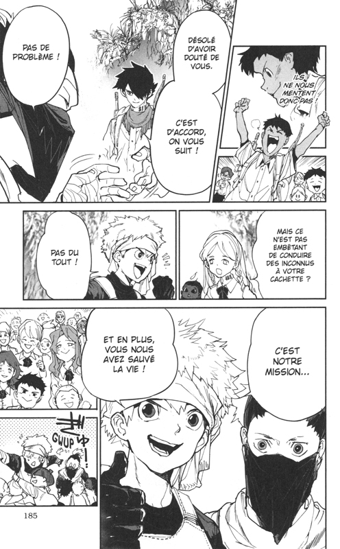 Kaiu Shirai trouve toujours le moyen de rendre chaque tome de cette série assez haletante. Quand on pense enfin arriver à un élément qui va aider à leur libération, il arrive quelque chose d’improbable. Minerva existe bien et vient au secours de tous les enfants enfermés. Mais cet homme est-il vraiment le bienfaiteur qu’il veut faire croire ? On doute même de l’honnêteté de certaines actions. Le scénariste aime bien nous surprendre en court de route même si nous nous rapprochons de la fin. Il met toujours en exergue la volonté, le courage, le travail de groupe et l’abnégation. Ainsi, il fait tuer les plus vieux qui se sacrifient pour sauver le groupe. La mort ne se conjugue plus uniquement à l’extraterrestre. L’humain devient une victime qu’elle soit pour ou contre le système de ferme d’élevage. Une ambiance un peu tendue se fait ressentir. Les sentiments n’arrêtent pas d’être sollicité car entre peur et espoir, nos personnages n’ont pas de répit. Ils ne pourront le connaître soit libre soit mort. Les planches de Posuka Demizu contribuent à donner du dynamisme et du stress grâce à la précision dans les mouvements, les choix de cadrage audacieux et les expressions des visages. Un duo artistique très complémentaire qui nous plonge encore une fois en totale immersion dans ce monde si singulier.
