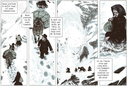 La médiathèque a recommandé cette bd. Alors sans même regardé le résumé et le graphisme, j’ai réservé l’ouvrage. Mais qu’elle ne fut pas ma déception quand j’ai ouvert la bd. Une ambiance colorée sombre, des traits noirs surtout pour les visages très marqués, créé tout de suite un malaise. Et cela correspond vraiment Anthony Pastor voulait donner. Car nous sommes dans la Savoie, une zone reculée, très rude avec des gens à l’esprit étriqué, cruel et assez malveillant entre eux. La guerre n’a pas aidé à rendre les gens bienveillant. Et on rajoute dessus la condition de la femme qui doit être soumise et se taire. Vous l’aurez compris, rien de réjouissant là-dedans. Une façon de mettre exergue une société injuste et intolérante. Les pages se tournent avec une certaine tristesse qui ne nous quitte jamais. Nul part un filet d’espoir n’apparaît. Rien de bon ne pourra jamais arrivé, c’est ainsi et pas autrement. Alors si vous avez le moral dans les talons ou que vous venez de la Savoie, vous trouverez ici une histoire bien sombre et malheureuse.