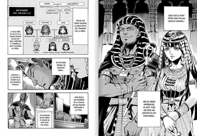 Les mangas historiques ont le vent en poupe récemment. Alors pourquoi ne pas en profiter pour publier une série autour de l’Egypte ancienne qui fascine tant le public. Chie Inudoh décide de s’inspirer pour « Reine d’Egypte » d’une des plus anciennes reines de l’Histoire : Hatchepsout. Comme quoi la question de l’égalité professionnelle ne date pas d’hier. Effectivement, elle aurait pu aller dans la facilité en prenant Cléopâtre ou Néfertiti, plus connu du grand public. Pourquoi faire l’évidence alors qu’il existe d’autres destinées plus mystérieux ? En plus, cette reine a laissé des témoignages de son règne dont même des statuts à son effigie et une momie. Donc la mangaka à une personnalité, un contexte historique et des rites propres à leur religion. Tous les éléments sont réunis pour faire un récit haletant, pleins de rebondissements. Toutefois, elle prend quelques libertés historiques pour donner plus de caractère à son héroïne. A l’époque rien de surprenant que l’on se marie entre membre d’une même famille. Mais Hatchepsout régnait car son mari était encore un enfant. Un peu comme les régentes en France en attendant que le roi soit majeur. Cependant, la mangaka ne stipule nulle part qu’elle fait un manga historique dans la limite des connaissances actuelles. Elle s’inspire d’un personnage réel pour créer une histoire avec des éléments véridiques. Toutes la nuance est là. Ce qui n’empêche de se prendre au jeu et de tourner les pages avec satisfaction.
