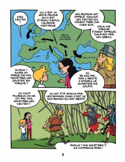 Déjà est-ce ceux que l’on nomme les Gaulois étaient vraiment Gaulois ? « Les romains ont appelé « gaulois » les celtes qui vivaient près de chez eux. Ceux de Turquie étaient appelés « galates » par les grecs ». Nino pose alors une bonne question : « Du coup, pourquoi on ne dit pas « nos ancêtres les celtes ? ». Ariane lui répond simplement : « Ils ont été vaincus par les romains. Donc c’est le nom romain qui est resté ». Les représentations de ce peuple est-il vraies ? L’imaginaire français est peuplé de l’image de ces hommes torses nus avec des casques avec des ailes ou d’un Vercingétorix fier déposant les hommes au pied de César. Tout cela est erroné aussi. Des politiques avaient besoin de montrer une culture ancienne pleine de fierté pour faire de la propagande et le choix est tombé sur les gaulois. Maintenant les historiens en savent plus sur ce peuple nomade qui était sédentaire, cultivait les champs, faisait de la bière et proposait des mercenaires. Une nouvelle histoire plus véridique s’écrit de nos jours.