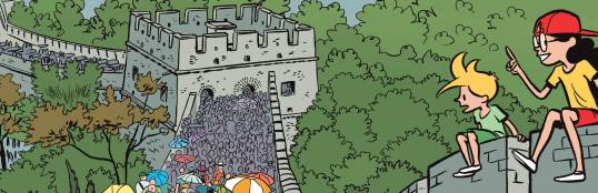 Ariane et Nino jouent au frisbee dans le jardin. Mais malheureusement le jeu s’arrête car l’objet volant identifié est passé au-dessus de la haie du voisin. Comment le récupérer ? Ariane rassure son frère : « Oh, ça devrait aller ! C’est pas la muraille de Chine, non ! ». Nino ne comprend pas la référence : « C’est comme ça qu’on appelle les haies en Chine ? » Une belle entrée en matière pour faire un voyage dans le temps. « Non, je te parle du plus grand monument jamais construit de toute l’Histoire ! Il fait 21 000km de long et s’élève parfois à 8 m de haut ! ».