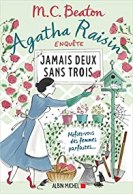 On pourrait croire que le roman policier va être parsemé de suspens, de tension, de pression… Mais non car dès la couverture, l’identité d’une coupable va vous être dévoilé : « Méfiez-vous des femmes parfaites… » puis le titre « Jamais deux sans trois ». En même temps, on ne lit pas une aventure d’Agatha Raisin pour être emporté dans les tourments et la noirceur. Il y a ce qu’il faut largement dans la littérature de genre. On tourne les pages de ce genre de roman pour se balader dans la campagne anglaise avec son lot de voisin curieux, de choses bizarres et des rencontres improbables. Sans oublier le côté histoire d’amour entre cinquantenaires avec infidélité, mensonges et jalousie. Et bien entendu des amis en or qui sont toujours là dans toutes les situations et surtout remonter le moral. Bientôt elle va en avoir besoin car c’est le moment de dire bonjour arthrite. Les méchants seront punis. Et Agatha and friends vont aider à coup de bluff et de recherches trouver des indices. Une lecture reposante et distrayante qui ne vous fera jamais un noeud au cerveau. Bien au contraire, cela vous distraira juste ce qu’il faut avant votre prochain livre.