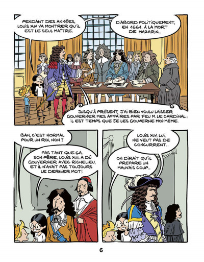 Nino et Ariane partage un moment en famille autour de la galette des rois. Nino est ravi car il a trouvé la fève. « Je suis le roi ! Je peux faire tout ce que je veux ! » Ariane le reprend en lui disant que ce n’est pas totalement vrai. « Louis XIV, par exemple, un des rois les plus puissants de l’histoire a travaillé toute sa vie pour imposer son autorité. » Rien de tel qu’un petit voyage dans le temps pour lui expliquer la vie de ce roi. Louis 14 naît le 5 septembre 1638 et il est le fils de Louis 13. Comme le veut la tradition, quand un roi meurt c’est son descendant qui prend la relève. Alors âgé de 4 et demi en 1643, Louis 14 devient roi. Mais il est bien trop jeune pour régner. « Le pouvoir est alors exercé par sa mère, Anne d’Autriche et surtout par le Cardinal Mazarin, premier ministre. » A 10 ans, il doit fuir car la Fronde grogne et sa vie est en danger. « En 1653, la révolte est vaincue. Louis n’est encore qu’un adolescent au pouvoir fragile… Mais il a la volonté de s’imposer. Il participe alors à un spectacle, le « ballet de la nuit », où il apparaît costumé en soleil ! Cet évènement marque le début de son affirmation en roi absolu. »