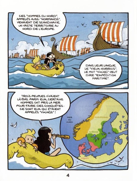 Ariane et Nino profitent de leurs vacances en allant sur l’eau avec leur bateau gonflable. Elle interpelle son petit frère : « Tu n’as pas envie de partir à l’aventure? Laisse parler le « viking » qui est en toi? » Il ne voit pas qui évoque sa soeur. « Oui, comme ces aventuriers des mers qui ont vécu au Moyen Age et ont conquis les océans. » C’est parti pour un voyage dans le temps à la rencontre de ces hommes qui ont changé le visage du monde. Les vikings désignent ceux qui ont pris la mer et viennent de Scandinavie. Ils se réunissaient en groupe et embarquaient sous l’ordre d’un chef. Entre le 8ème et le 11ème siècle, ces hommes écument les mers et sèment la terreur partout où ils s’arrêtent. A la fois, ils font du commerce et créer des ports pour faire du commerce. Les marchands ont été jusqu’à Bagdad. Et d’autres allaient pour conquérir de nouveaux territoires car ils subissent la surpopulation. Erik le Rouge décide d’aller encore plus loin sur la mer. « Erik découvre vers 980 un territoire encore plus grand qu’il nomme « Groenland », le « pays vert ». Son fils Leif Erikson poursuit le voyage et ira plus loin, en Amérique, qu’il appelle « Vinland ». Ils deviennent plus féroce dans leurs attaques et sont craintes. Pour protéger leur pays, on leur donne des terres pour avoir la paix. Pour d’autres, on leur propose de devenir des mercenaires au service d’un personne riche. Ainsi les vikings se retrouvent partout et presque tous perdent leur culture par rapport à celle du pays. Même leurs croyances tombent dans l’oubli au bénéfice de religions monothéistes. Mais les ancêtres vikings sont très nombreux dans les arbres généalogiques.