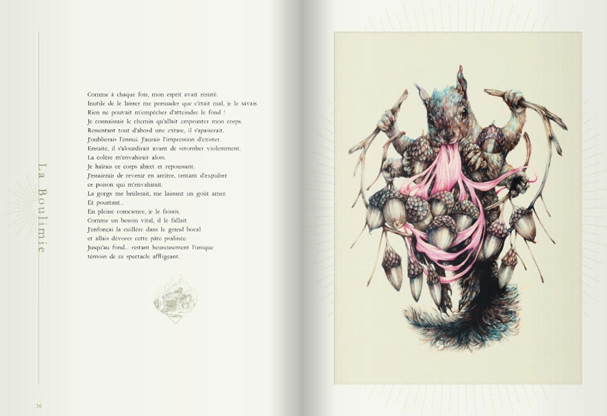 Tout débute avec une citation attribuée à William Shakespeare : « La folie fait le tour du globe, comme le soleil elle brille partout ». Et en cas où vous doutiez où vous allez, la première phrase de l’introduction de Lydia Lacombe-Csango, Docteure en psychologie vous donne la réponse. « Dans cette ouvrage Sébastien Perez et Marco Mazzoni s’aventurent à explorer ce que Sigmund Freud appelait « la psychopathie de la vie quotidienne. Ce faisant, ils s’inscrivent dans une longue tradition artistique, toutes disciplines confondues. » Alliant mots et graphisme, ils définissent à leur façon des pathologies de la plus discrète à la plus visible. L’aventure nous mène à travers des premières images, d’un centre qui pourrait ressembler à asile, un hôpital psychiatrique. Puis vint le premier mot : l’Anorexie. Une petite histoire avec une mise en situation. Et pour mieux s’approprier l’affection, quelques cases illustrées. Par contre, vous ne verrez pas d’humains dans les représentations. Seule la nature se montrent à travers des charmants oiseaux, de délicates plantes, des poissons mystérieux, des écureuils gourmands, un crapaud hystérique… Et de ces treize extraits de journaux intimes forment douze tableaux qui lorsqu’ils sont réunis forme une image du responsable de cette folie. Une image qui réunit sur un poster que vous pourrez afficher l’égarement où vous le souhaitez.