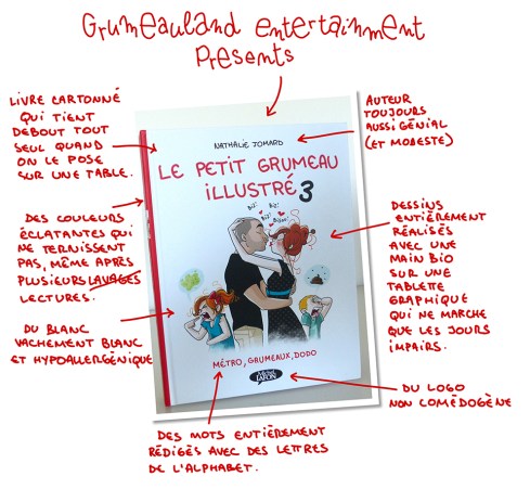 Et oui, être maman et construire sa famille, c’est vraiment une aventure au quotidien. La dessinatrice partage via son site ces dessins qui sont rassemblés dans des albums. Ce tome 3 du petit Grumeau illustré raconte les mésaventures d’une famille avec l’arrivée du 3ème enfant qui fait sa vie et de l’adaptation des deux autres. Sans oublier le chat de la maison, Bouboule, qui va subir plus de choses qu’un simple félin de maison ne peut subir. Chaque jour son lot de surprises et de catastrophes. Le graphisme de Nathalie Jomard insuffle à ces petites histoires du peps avec des couleurs chaudes. Le côté chaleureux est bien au rendez-vous et c’est nécessaire puisque c’est fait pour rire. Comment résister à la difficulté de tenir face au manque de sommeil suite aux pleurs de bébés? Comment ne pas sourire quand les parents amoureux tentent de s’embrasser devant les enfants dégoutés? Et des moments de grande philosophie de la plus jeune qui veut raisonner ses parents à grand renfort d’absurdité. Aucun doute que beaucoup de parents se reconnaîtront dans bien des situations. Un cadeau idéal à offrir à vos amis surtout s’ils ont trois bambins dont un tout jeune.