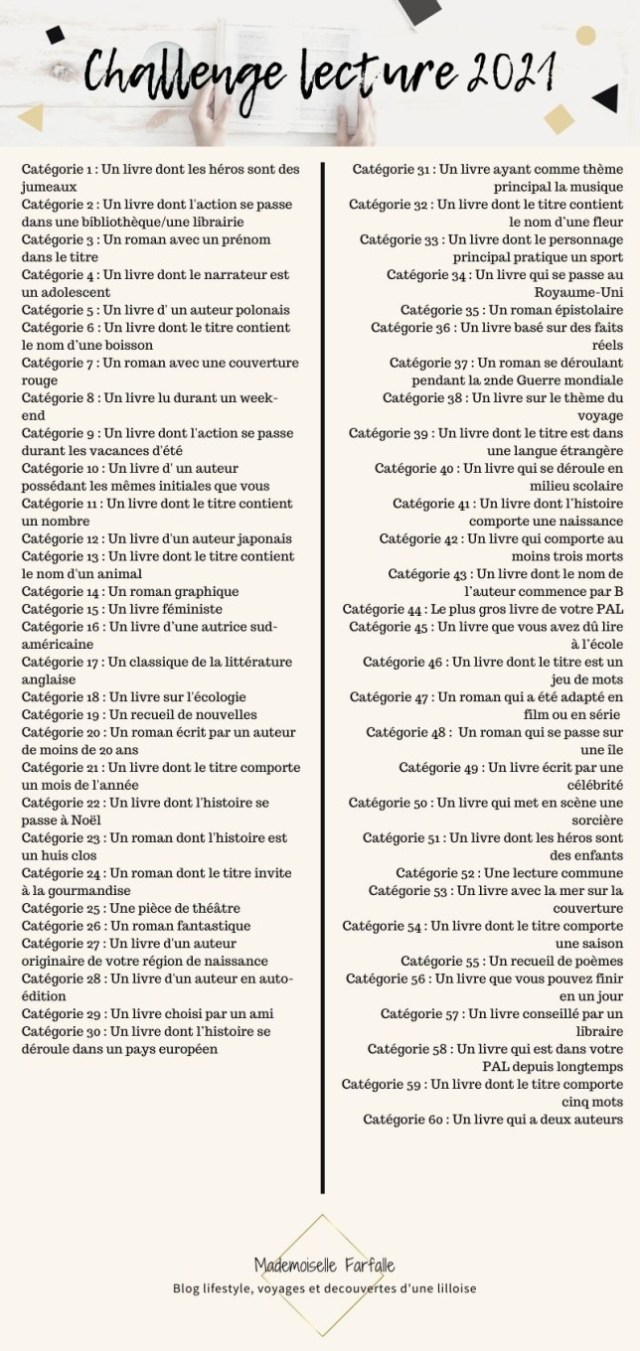 Qu’est-ce qu’il peut y avoir en 2021 à part covidou? Mlle Farfalle nous propose un très jolie challenge. Elle le présente ainsi : « L’idée de ce challenge est de faire des découvertes et de sortir un peu de sa zone de confort. »