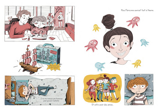 Gulf Stream éditeur traite avec simplicité des sujets qui concernent les adolescents comme le harcèlement moral, l’homosexualité, le suicide. On trouve par exemple les bd de Charlotte Bousquet et Stéphanie Rubini avec « Invisible », « Bulles & Blues », « Mots rumeurs, mots cutter » et « Rouge Tagada ». Cette bd pour les plus jeunes, puisqu’ici l’histoire se déroule à l’école primaire est dans la même veine. Grâce au neuvième art toutes les thématiques peuvent abordées simplement, sans jugement, sans culpabilisation. Sophie Adriansen et Clerpée trouvent le tout juste pour évoquer une situation sensible et comment y faire face. Le petit nouveau se fait racketter par trois filles de sa classe. Difficile d’en parler aux parents, il faut trouver les mots. Souvent les enfants ont peur d’embêter leurs parents, ont des difficultés à dire les mots et ont honte. Ils doivent trouver des moyens de s’en sortir par eux-mêmes sauf que seul tout est plus difficile. Ce récit montre qu’il y a toujours des adultes qui peuvent aider et que c’est en libérant la parole que les choses changent. Un ouvrage à mettre entre toutes les mains afin de changer des situations traumatisantes.