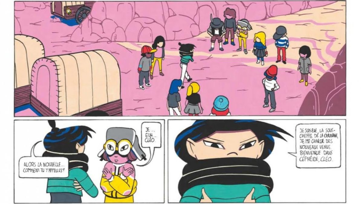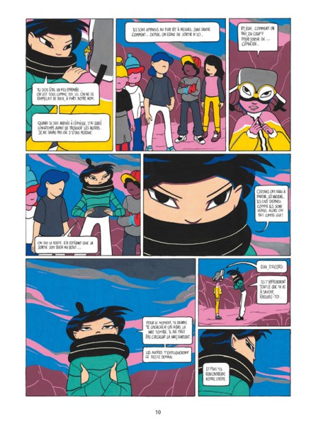 La couverture intrigue tout de suite. Nous avons deux adolescentes qui ne regardent pas le lecteur. Leurs regards se posent vers d’autres chemins. Et si cela happe notre intention, le pari de la dessinatrice est gagné. L’univers graphique change de ce que l’on peut voir surtout dans la bd jeunesse. C’est un subtil mélange entre le monde Dune, les déserts dans Star Wars, des photos de Mars, « Amer béton »… Le tout avec des dessins nets, des aplats de couleurs, des teintes sobres et chaleureuses… de Mélissa Morin. C’est l’atout charme indéniable de cette bd. Car l’histoire est tout autre chose. On tombe dans une société d’adolescents qui a tout oublié du monde d’avant. Ils s’organisent comme une société d’adultes avec une cheffe qui distribue les tâches à chacun et qui a une compétence particulière. Et il y a le mal, le méchant qui se présente sous forme de monstre qu’il faut impérativement chasser. Il enlève les enfants et après on ne les revoit plus. Sauf que Cléo se transforme en monstre après avoir trop bu d’une boisson un peu particulière. Après craché un caillou, elle redevient humaine. Car lorsqu’elle retrouve Moonsun, une nouvelle aventure se propose à elle. Ont-elles accepter de grandir ? Je vous que je suis restée sur ma faim. Tout prend son temps pour être installé et après tout se précipite pour finir précipitamment. En effet, la question de l’organisation d’une société, les rapports entre les dominants et les dominés, la capacité de se remettre en question, d’assumer ces choix et surtout la volonté de ne passer à l’âge adulte sont abordés. Mais est-ce assez bien marqué, raconté pour en faire la différence ? pour capter plus l’attention du lecteur ? Est-ce que tout nous entraîne dans cette quête initiato-fantastique ? Malheureusement non. Toutefois, il est possible que le regard d’un adolescent pourrait être tout autre.