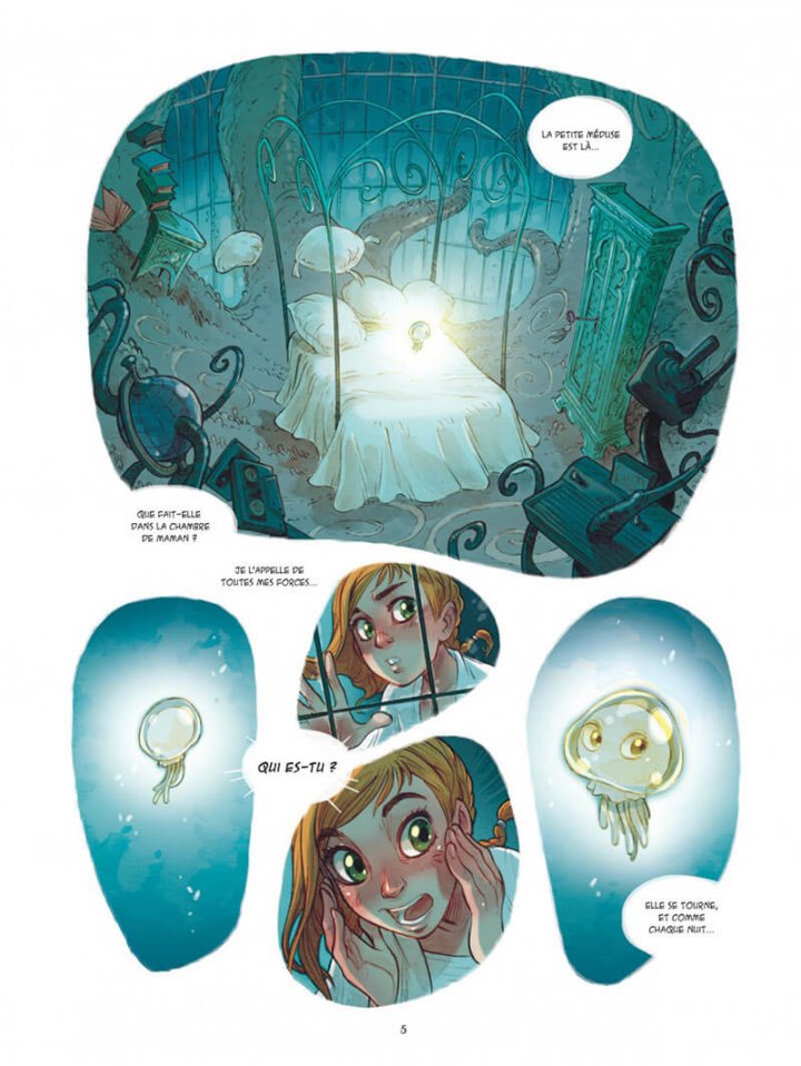 Comment évoquer le fait d’avoir perdu un enfant à sa progéniture? Un sujet sensible à aborder, souvent assez tabou. Giovanni Di Gregorio décide de s’emparer ce sujet pour l’évoquer avec une partie de magie et d’onirisme. Sarah sent que ces rêves avec les méduses sont en lien avec sa mère. Et au fur et à mesure, cette sensation va devenir réelle et trouver un sens. Une façon délicate d’aborder la mort d’un enfant et la difficulté de s’en remettre. Une parole qui peut se partager avec la famille pour partager sa souffrance et la remplir d’amour. Le fait d’aborder cette thématique avec une partie de fantastique permet l’alléger le sujet. Et de montre aussi qu’une famille peut se composer d’une mère qui élève ces trois filles seules et soutenue par deux amies. Un choix loin du cliché trop fréquent en bd jeunesse. L’audace se trouve aussi du côté graphique. Alessandro Barbucci qui a déjà à son actif « Sky Doll », « Monster Allergy », « Ekhö monde miroir« … Le merveilleux est encore au rendez-vous avec cet univers vaporeux, lumineux, classique et à la fois moderne. On tourne les pages avec curiosité car on est prend plein les yeux. Le scénario est lui aussi tiré au cordeau. Un ensemble qui donne envie de retrouver cette tribu dans une nouvelle aventure.