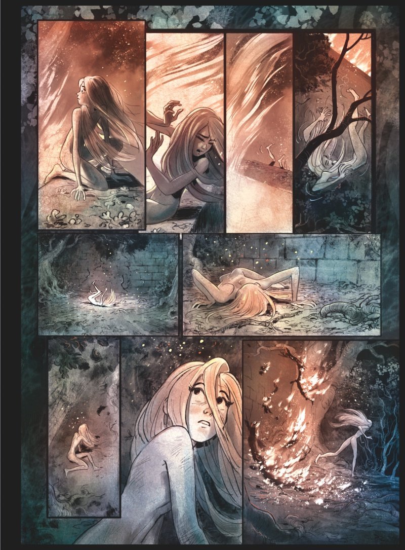 Au premier coup d’œil à la couverture, on a une envie folle de se plonger dans cette aventure. On voit une très jolie jeune fille, blonde aux cheveux long et au regard triste. On s’attache tout de suite à elle grâce à ce mélange de beauté et de fragilité. Mais derrière, dans l’ombre, sont tapis des êtres à l’apparence cruelle et sauvage. Leurs yeux rouges n’augurent rien de bon. Et tout se déroule dans la nature, qui doit jouer un rôle important. Tout le contexte est déjà posé là. Puis on rentre assez vite au cœur de l’action, avec un grand incendie qui ravage tout sur son passage. On découvre notre brindille qui passe de la nudité à quelques habits très légers. 5 feuilles sont censées cachés une culotte. Rassurez-vous, elle n’a pas froid car elle porte des gants, des protèges coude et des chaussures. Tout va bien. Derrière cette apparence avantageuse se cache chose de capitale, d’incontournable. Un équilibre fragile dépend de sa capacité à se souvenir. Tant qu’elle ignore son identité, le mal, la sauvagerie va prendre le dessus. Trouvera t’elle l’élément qui changera la donne ? Un loup qui ressemble à un renard aussi bien dans la forme que la couleur l’a accompagné un moment pour veiller sur elle. Seul face à une horde, on ne pèse pas lourd. Le côté obscur attire toujours plus que la lumière, c’est plus facile et il y a moins à réfléchir. On sent qu’il y a de gros enjeux. Nous connaîtrons la finalité dans le tome 2. Par chance c’est une série en 2 tomes comme annoncé en couverture. Au moins, on n’assistera pas à une tentative de brasser du vent pour vendre des tomes en plus. Côté graphique, j’aime assez d’avoir fait le choix des pages noires et non blanches et pour l’ensemble de l’histoire. Et aussi la mise en page, avec des cases dans des cases plus grandes qui peuvent recouvrir une page. Cela fluidifie la lecture et nous plonge plus au cœur de l’action. Tout est réuni pour lire la suite.