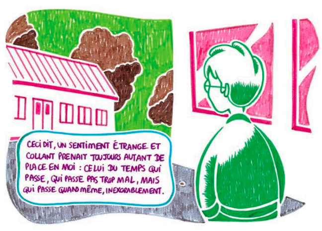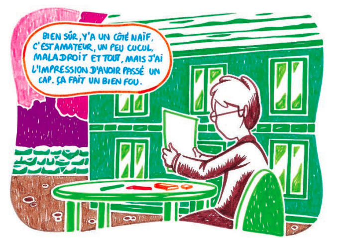 Septembre 1995, c’est là que tout commence. Il descend à l’arrêt de bus « Ecole départementale ». Lieu le plus proche du lycée Cherioux, école choisi pour sa section arts appliqués. Parmi de très nombreuses candidatures, il a été choisi. Trop heureux de pouvoir enfin aller à l’école avec plaisir et de le partager avec d’autres. Le premier jour c’est un peu intimidant d’aller parler aux autres et très vite, ils deviennent potes. Même avec Amélie qui aime frotter ces seins dans le dos des autres gars. Est-ce que tous les cours sont passionnants ? Bien entendu que non, surtout avec la philosophique avec des questions telle « Qui suis-je ? ». Les publicités et le cinéma influencent les goûts comme cette garçonne dans la pub Crunch ou Winona Ryder dans Alien. « Je me suis calmé avec ce truc de cheveux courts. Maintenant, je reste hypnotisé une seule minute au lieu de cinq avant. Peut-être dans 10 ans je serai guéri et j’arriverai à me dire que longs ou courts, c’est juste de la tignasse ». Sans oublier la musique, comment s’en passer ? Elle est là pour attiser les sentiments, les partager, se défouler. Elle créée du lien. Pour la réflexion, il y a une claque graphique avec Akira. Des lieux abandonnés, une société remise en question, la pollution, la guerre.. tout y est abordé avec intelligence. « En me promenant dans cette bd, j’ai l’impression d’être dans le futur. Un futur sans humanité, « propre »… ». C’est à son tour de trouver son univers graphique, à lui qui lui ressemble. Le monde du Studio Ghibli lui fait découvrir la force de l’onirisme. Les influences se grapillent au fur et à mesure des rencontres, des échanges… Puis le temps passe, bac en poche puis BTS où aller ? Quoi faire ? Un choix difficile car son cerveau à encore 18 ans. Pourquoi pas de la bd ?