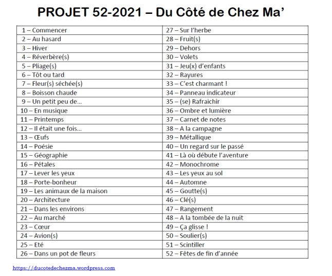 Et si on essayait de mettre un peu de merveilleux dans ce monde pourri? Ma nous propose de nouveau cette année son challenge photographique. Que diriez-vous de faire 52 photos sur notre quotidien autour de thèmes spécifiques?