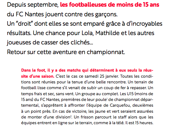Tout d’abord, on va rencontrer l’équipe de footballeuses du FC Nantes, qui n’ont jamais peur d’affronter des garçons sur le terrain. La plupart des jeunes filles aimeraient continuer en pro mais cela s’annonce difficile. Qu’importe, elles feront de leur mieux. En plus, elles sont souvent soutenues par leurs papa qui admirent leur enfant. Pas besoin d’avoir un service trois pièces dans le caleçons pour savoir courir après un ballon. Aucun doute que nos jeunes lecteurs regarderont peut-être d’un meilleur ces joueuses qui savent aussi faire leur preuve lors de rencontres internationales. En plus, les équipes féminines pro n’ont pas de scandales liés à la prostitutions ou abus de pouvoir. C’est vrai. Elles ne gagnent pas non plus les même salaires.