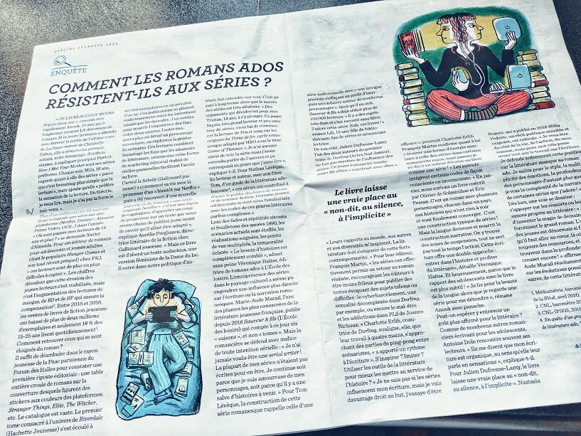 D’ailleurs l’enquête se nomme « Le roman adolescent peut-il résister aux séries? » par Raphaële Botte et Sophie Van Der Linden. Les lecteurs changent et les romans évoluent aussi. Des témoignages d’adolescents vous le prouveront. « Dès lors, une voie se dessine : s’appuyer sur les ressorts ou les puissances propres au littéraire : « A nous d’inventer la magie de demain et pas forcément le grand roman. L’attention des jeunes est désormais si fragile, qu’il faut aller au coeur, là où il y a toujours des ressources, et elles se trouvent dans les profondeurs : on peut creuser encore! » affirme une Marie-Aude Murail résolument optimiste sur les évolutions possibles, et nécessaires, de cette littérature ».