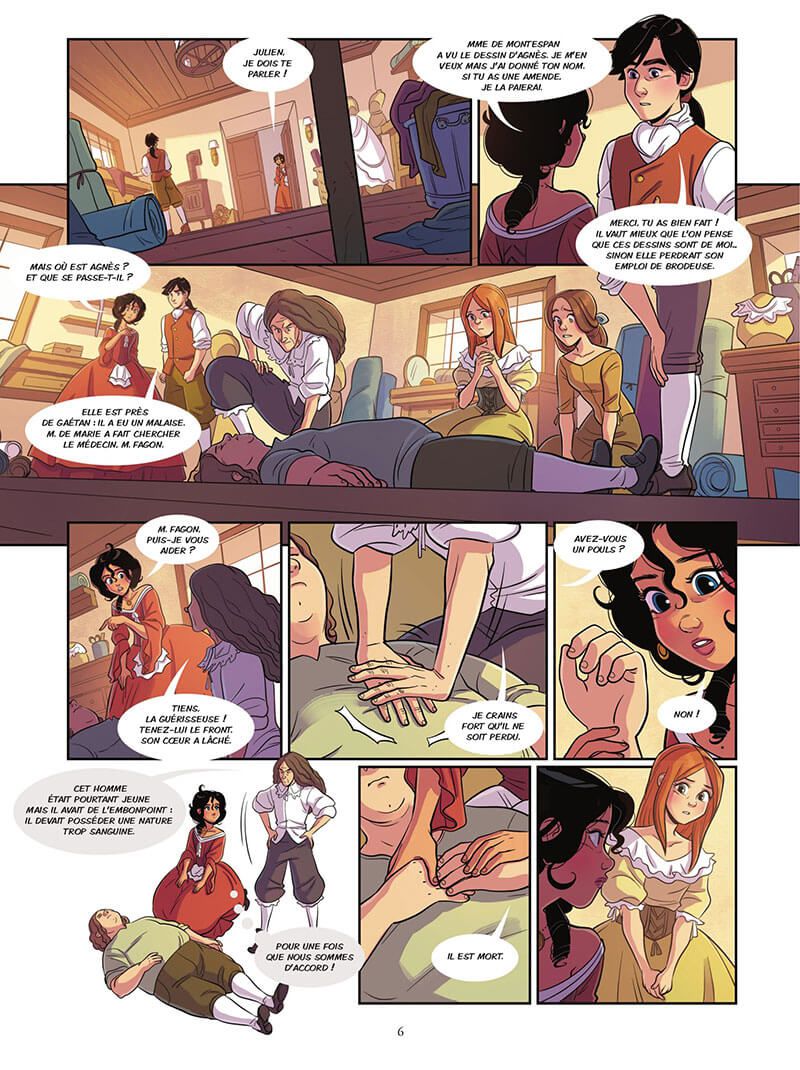 C’est sous le règne de Louis XIV que le luxe à la française à véritablement pris son essor. On rivalise par rapport aux autres pays dans la miroiterie, la céramique mais aussi la mode. Surtout que maintenant que les règles ont été établies sur une mesure unique en France et sur la qualité. Maintenant on peut innover dans des formes moins encombrantes, avec des tissus plus précieux… Et c’est un atout incontournable pour mettre en avant la femme, ces atouts et sa position sociale. C’est très important cette mise en avant. Pourtant seules des ordres assez fermés possédaient le droit de créer. Beaucoup de femmes devaient par conséquent limitées et rabrouées leur savoir-faire avant un changement de loi. Madame de Montespan voulait à tout prix garder ses privilèges. Elle a eu tout de même 7 enfants du roi. Pour éloigner toute concurrence, elle est prête à tout, qu’importe si c’est injuste. Carbone va s’inspirer de cela pour son histoire et aussi de la fameuse affaire des poisons, où la favorite a été inculpée et reconnue coupable. La scénariste a revisité le roman jeunesse à succès d’Annie Jay. L’Histoire revisitée pour séduire les jeunes lectrices. Giulia Adragna propose un style très classique, avec des personnes qui semblent avoir tous le même âge. Tout est fait pour pousser la curiosité à voir le passé autrement.