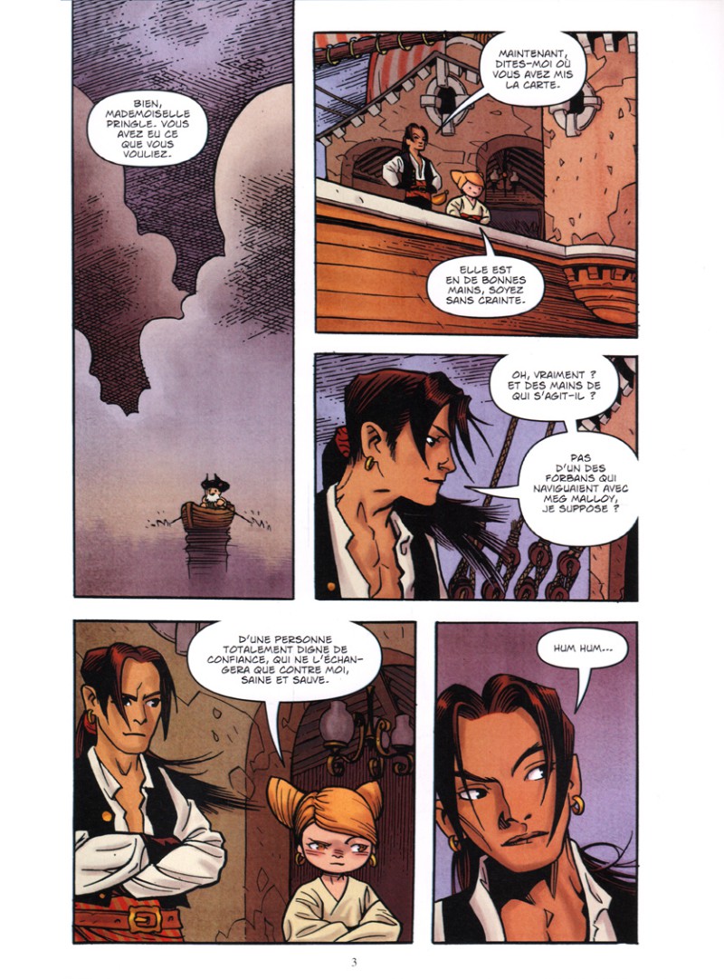 La petite Polly n’est pas une simple fillette terrifiée. Elle a pris le taureau par les cornes et va sauver Scrimshaw du prince des pirates. La carte au trésor attise beaucoup de convoitise. Le vieux briscard s’enfuit sur un canot de sauvetage son chapeau sur la tête. Le prince des pirates retient Polly et ne la relâchera que quand il aura la carte dans les mains. Mais en réfléchissant un peu la carte n’a pas du bouger de son lieu premier. Aussitôt, il donne l’ordre de poursuivre le canot. Toutefois, il n’avait pas pris en compte qu’un autre navire pirate allait l’attaquer. L’équipage de Polly vient à sa rescousse. Pas le temps de vraiment régler ces comptes car la marine nationale arrive. Par chance, pas très loin, il y a un endroit où se cacher. D’ailleurs, c’est là que le trésor se trouve. Tous ensemble, ils vont dans ce lieu et ils ne vont pas trouver ce à quoi ils s’attendaient. Et oui, les choses les plus importantes pour une capitaine pirate ne sont pas forcément un tas d’or.
