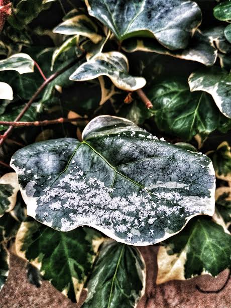 Large feuille qui récupère quelques flocons discrets pour offrir à boire aux moineaux …