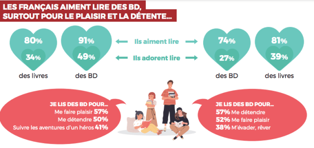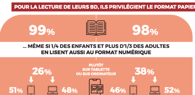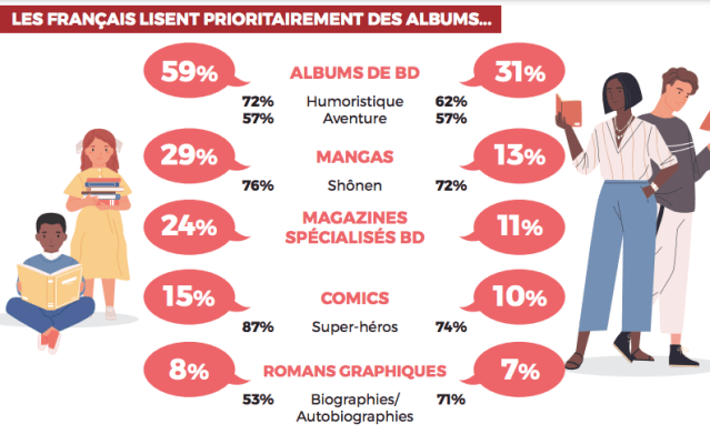 Les français lisent majoritairement et étonnement des albums. Au vue de l’augmentation des ventes des mangas, le chiffre me surprend.