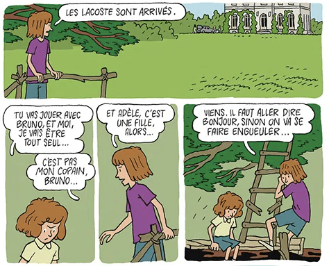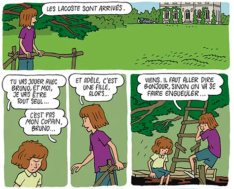 Il y a 2 ans, Antoine a monté une cabane avec Guillaume dans le vieux cèdre du jardin. C’était avant. Anatole n’est pas content, car il va jouer avec Bruno et lui va être tout seul. On verra en temps voulu. Il faut quand même aller dire bonjour aux Lacoste sinon la mère va râler. Sauf qu’il y a Adèle cette fois et les hormones d’Antoine commencent à le titiller. Il fait un peu le paon sur ces connaissances. Puis petit à petit, il prend un peu confiance en lui et passe du temps avec elle. Il est émoustillé quand il touche sa main lors d’un jeu de carte. Mais quand Guillaume, le grand frère rebelle de 16 ans arrive, l’ambiance change. Lui se permet tout et il est entreprenant. Pourquoi sortirait-elle avec lui ? « Par ce qu’il est dingue, parce qu’il est touchant… et beau aussi ! Et puis, il ose des trucs, il prend des risques. Il pourrait y passer à chaque fois, mais il s’en sort… » Comment faire mieux que lui pour se rendre intéressant au regard de la belle ? Il n’y a rien à faire et de toute façon elle part. Toutefois, il sera quand même récompensé de sa gentillesse.