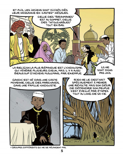 Nino est embêté à l’école par un garçon qui veut ces bonbons. Il le menace pour qu’il lui donne sinon il va le frapper. Sa grande soeur n’aime pas du tout ce genre de comportement violent. Ce n’est pas normal et il y a une façon de faire face sans rendre les coups. Pour mieux lui faire comprendre ça, elle va lui raconter l’histoire de Gandhi. Direction l’Inde en 1869, une jeune garçon avec un grand destin vient de naître. A 13 ans, on le marie à Kasturba. En grandissant, il refuse de rester enfermé dans le carcan dans lequel on veut le mettre. Il part alors à Londres pour étudier aussi bien le droit que les religions monothéiste que polythéiste. En revenant au pays, le travail n’est pas au rendez-vous. Heureusement qu’il trouvera un emploi dans une firme en Afrique du Sud. Seulement, il doit faire face à une violence qu’il n’imaginait pas. Quelque chose le pousse à vouloir changer les choses et autrement qu’avec la force. Il prône la non-violence ce qui convainc doucement et ce termine toujours par de la prison ainsi que des morts. La situation locale le pousse à retourner dans son pays et aussi prôner les mêmes valeurs. D’autant plus qu’il soutient la libération de l’Inde par les Anglais. Cette volonté nuit à l’occupant qui veut tirer des bénéfices des ressources tout en considérant avec mépris les autochtones. Des conflits très forts qui vont aboutir à la création de l’Union indienne et du Pakistan. « Le 13 janvier 1948, Gandhi, qui est hindou, commence un jeûne pour que s’arrêtent les violences contre les musulmans : encore un symbole de réconciliation ». Un nouveau combat qui lui vaudra de mourir face à un opposant. Les balles ont plus de puissance que les mots.