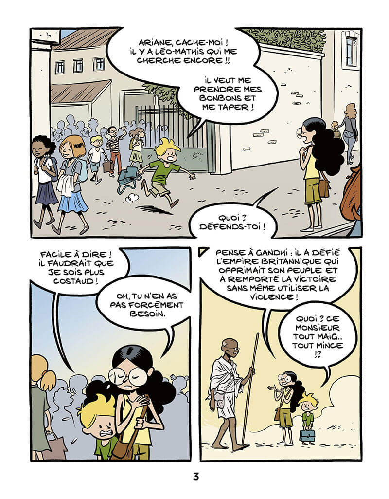 Les violences à l’école sont bien courantes et les chiffres en montrent l’augmentation. Faut-il vraiment suivre l’adage oeil pour oeil, dent pour dent? Difficile de croire qu’il est possible de faire autrement. Ariane dans sa démarche d’être une grande soeur à l’écoute et qui veut l’aider, lui raconte une histoire vraie. Un homme a voulu prouver que l’on peut changer les choses autrement. Ce n’est pas le premier, ni le dernier mais sa légende a été mise en avant en rentrant parfois dans les livres d’histoire. Un homme qui devrait inspiré les individus à d’autres comportements. Mais face au harcèlement à l’école ou dans la rue, est-ce possible d’agir avec la non-violence? Il n’y a pas de réponse toute faîtes à cela. Cela pourrait être intéressant d’avoir cette réflexion et de la partager avec son entourage. Aucun doute que les idées pourront se confronter. Pas besoin de se convertir à une religion ou de pratiquer pour modifier son comportement et influencer les autres dans une démarche pacifiste. Le duo Fabrice Erre et Sylvain Savoia mêlent une nouvelle fois leur talent de pédagogue, de raconteur et d’historien pour une bd à destination des enfants. Même si les biographes actuels sont plus nuancés sur le vrai pacifisme de Gandhi. L’Histoire ne s’écrit pas forcément qu’avec un seul regard et pas forcément que celui des gagnants. Toutefois, c’est une belle entrée en matière qui montre la largesse d’un champ des possible.
