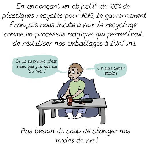 Mais il est possible de faire des choses quand même au niveau de l’état tout en permettant aux entreprises avec des lobbyistes de continuer à faire des bénéfices. On peut commencer avec la sensibilisation au recyclage. « En annonçant un objectif de 100% de plastiques recyclés pour 2025, le gouvernement français nous incite à voir le recyclage comme un processus magique, qui permettrait de réutiliser nos emballages à l’infini. Pas besoin du coup de changer nos modes de vie! ». Mais on ne peut pas recycler l’ensemble des plastiques, ni l’ensemble des déchets. Heureusement, on peut sur la science qui peut tout changer. « Côté énergies renouvelables, rien de magique non plus. La mise en place d’éoliennes ou de panneaux solaires nécessite l’usage de matières premières, et notamment de métaux rares. » Il ni a pas d’énergie propre. Il faut savoir les compromis qu’il est possible à faire et combien cela peut rapporter. L’énergie ne peut être accessible sans être subventionnée. alors