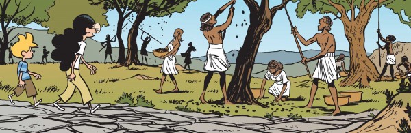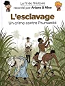 Nino se plaît car il doit débarrasser la table. « Pfiou, on ne pourrait pas inventer une machine pour débarrasser la table? On en a bien une qui fait la vaisselle! » Ce à quoi sa soeur lui répond : « Tu sais, les machines existent depuis peu de temps. Avant, presque tout le travail, même pénible ou dangereux était fait par des humains. ». Le jeune garçon est surpris : « Et ils acceptaient ça? ». Afin de lui faire comprendre les circonstances de cela, Ariane embarque son frère dans le passé. L’esclavage n’est pas une histoire récente. On en trouve chez les égyptiens, les chinois, les romains… Puis le développement des guerres et des voyages a fait augmenter la nécessité d’une main-d’oeuvre pas cher et bon marché. Musulmans et catholiques ont conclu un accord afin d’aller asservir ceux qui avaient une autre foi pour leur besoin. L’esclavage se réparti partout avec violence, injustice et haine. Il fallut attendre le 19ème siècle pour y mettre fin du moins dans les textes. Car dans les faits c’est tout autre chose qui se passe. Les grands propriétaires terriens ne veulent pas perdre leur revenu. Par exemple, aux Etats-Unis en 1865, l’abolition de l’esclavage est voté à l’unanimité. Toutefois cela a donné la ségrégation définie dans les lois de Jim Crow dans les années 1870. Cela existe encore de nos jours sous bien des formes avec des femmes esclaves sexuelles de terroristes, d’enfants exploités en Afrique ou d’hommes Pakistanais dans des pays du monde arabe dans la construction.