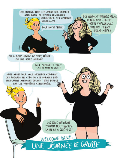Que cela soit dans la presse, à la télévision, au cinéma… on voue un véritable culte à la minceur. On parle quand même du succès d’émissions de téléréalité avec des gens qui exposent leur minceur avec gros seins, tablette de chocolat avec un énorme supplément de bêtise humaine. Et dire qu’il y a des scénaristes en plus pour créer du contenu par dessus le culte de la superficialité. Le public est là à regarder ça. Au moins cela donne du travail à des esthéticienne. La perfection pour l’oeil exige un 0 poil. Alors comment croire que cela ne créé par du mal-être chez des gens ordinaires où leur boulot n’est pas le culte de leur corps. Grâce à ça, les salles de sports peuvent se remplir de personnes qui s’admirent dans le miroir. Mais quand toi, tu ne rentres pas dans du 38, d’ailleurs, tu ne te souviens pas quand c’est arrivé la dernière fois, comment éviter le jugement des autres. La grossophobie est vraiment très marqué en France. Si tu es gros c’est que tu es fainéant et bête. Est-ce que cela pourrait être autre chose? Il faudrait croire que non. Ces idées très préconçues sont aussi très répandues dans le corps médical qui parfois ne vous écoute pas, ne fait pas d’examen. Il y a juste une réponse : faites un régime. Le serment d’hypocrite touche aussi de nombreuses professions. Si tu es limité comme personne, il n’y a pas de raison que cela change lorsque vous faîtes un métier en relation avec autrui. De ce fait, quand on est gros, obèse, différent, il faut prendre chaque jour pour un combat contre les regards pleins de jugements des inconnus, des collègues, de ton boss, du serveur au restaurant, de la vendeuse dans le magasins de vêtements… Le moral n’est par conséquent tous les jours au beau fixe. Mademoiselle Caroline et Mathou le savent très bien. Elles partagent avec bonne humeur et amertume un quotidien qui a souvent besoin.