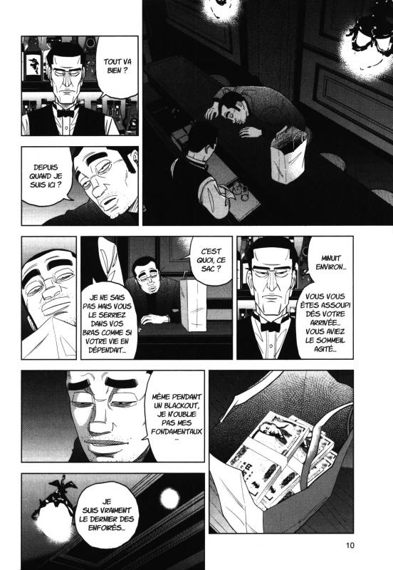 La fin justifie t’elle tous les moyens? Pour notre héros, l’inspecteur Kurokôchi aucun doute. Cela ne lui pose aucun problème que toutes ces pourritures se tirent dessus et meurent. Est-ce vraiment si important? Son binôme de vérité, n’a pas le même discours. Il est encore bien innocent dans le milieu. Il a encore la naïveté de croire en la justice même si cette tendance progressivement est remise en question. La corruption est tellement grande qu’il est difficile de trouver des hommes honnêtes dans la police. Y a t’il quelque chose de mieux que le fric? La loi est-elle vraiment le garant de la morale ? Bien entendu que non. A chaque fois que l’on avance dans l’histoire, impossible de ne pas être convaincu fasse à ces vieux gros dégueulasses, vicieux, violents et sans cœur. L’intrigue avec cette assemblée prend ici une autre tournure car les 300 milliards de yen ont été volés. Le voleur veut récupérer aussi son du. Tout un autre micmac se met en marche et cela promet des rebondissements sanglants. De nouvelles informations vont nous être donné et ainsi encore se rendre compte du niveau de traitrise. Jusqu’où cela va aller? Et notre gentil Shingo que serait-il prêt à faire pour savoir pourquoi on a assassiné son père? Et pour cela devra t’il se salir les mains? Va t’il passer du côté obscur de Kurokôchi et prendre lui aussi cette tête de con qui le caractérise tant? On n’est pas au bout de nos surprises. Vivement la suite.