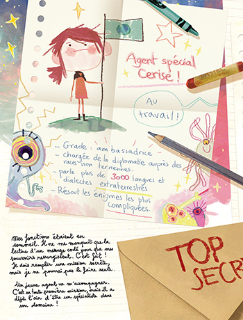Cerise n’est plus la jeune enquêtrice qui revenait tranquillement le soir retrouver sa maman à la maison. Maintenant, il faut prendre un nouveau départ car elle a un demi-frère qu’elle aime beaucoup. Recomposer une famille n’est pas si facile. D’ailleurs, Valentin ressent la peur face à tous ces changements dans sa vie. Il s’isole de son côté alors qu’ils doivent partir faire le tour du monde. Cerise propose au jeune garçon de mener une enquête sous l’angle de de la science-fiction avec une fusée et des extraterrestres. A chaque étape, de cette aventure, l’enfant dévoile ses craintes. Ce duo de charme s’ouvre l’un à l’autre pour avancer ensemble et libérer un personnage extra-terrestre, Toloh-Tim. Une façon élégante d’établir un lien pour mettre les mots sur les peurs. Grâce à cette capacité d’imagination les sentiments s’affirment et se libèrent. La nouvelle famille va pouvoir partir l’esprit tranquille.