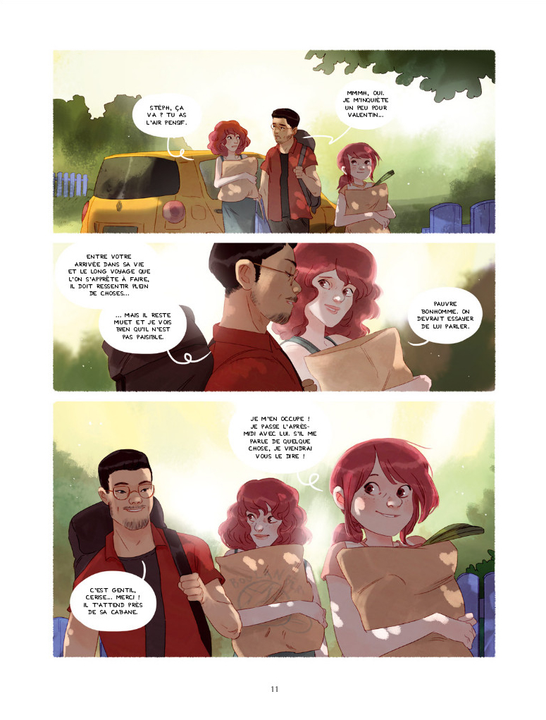 On était habitué de suivre les aventures de Cerise. Mais ce tome est à part car notre pré-adolescente a grandi et maintenant elle est grande soeur. Former une famille n’est pas facile d’autant plus quand un voyage autour du monde qui s’annonce. C’est beaucoup de changement pour un jeune garçon qui va devoir quitter sa vie d’avant. Mettre des mots sur ce que l’on ressent est difficile, même pour certains adultes. Aurélie Neyret utilise la forme du carnet avec l’écriture, des dessins, des photographies retravaillées. Contrairement aux tomes précédents, ce style graphique est celui majoritairement utilisé. Une rupture esthétique qui s’explique par le magnifique scénario de Joris Champlain. Une manière très élégante de parler de ce que l’on éprouve et de pouvoir en parler de façon détournée. Avoir peur ne veut pas dire être peureux. Les doutes c’est normal surtout quand tout devient différent. Et parler à des adultes c’est difficile car les plus jeunes prennent pour acquis que l’on ne peut pas les comprendre. Cerise est le bon élément pour faire la transition et comprendre les deux parties. Il est possible que les fans de la première heure de la série soient déçues car nous sommes dans un autre registre. Toutefois c’est l’occasion d’aller vers un autre public, plus jeune et plus masculin aussi. La lecture est aussi une belle opportunité d’engager un échange avec un enfant lors d’un changement et pourquoi pas reprendre la fiche des sentiments. En mettant des mots sur ce que l’on ressent, on va mieux et ensemble.