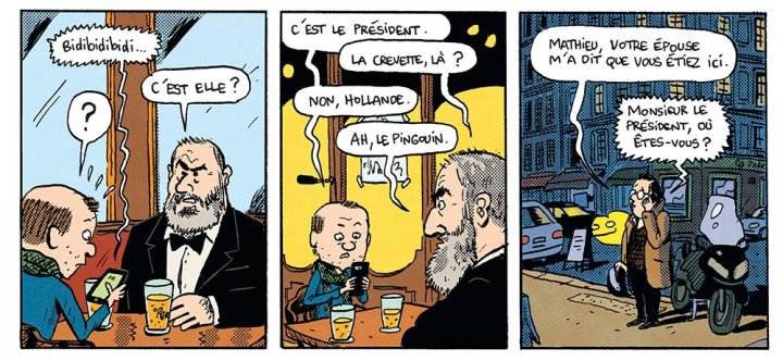 Tout débute à New-York, à l’aéroport John Fitzzerald Kennedy où un homme assez imposant aimerait embarquer. Difficile pour lui de passer inaperçu avec ces 2m20, son imperméable et ses lunettes noires. D’ailleurs, très vite les militaires l’encerclent et lui demandent de faire demi-tour. Yaacov Kurtzberg garde son calme et retourne à la ville en taxi. Au même moment, à Paris, François Hollande reçoit un étrange appel de Nicolas Sarkozy à 2h00 du matin. Il faut qu’il aille le rejoindre et sans son garde du corps. Le ministère secret doit entrer en action. Julie Gayet lui dit sur le bord de la porte : » François! S’il te propose des choses pornographiques ou des valises de billets, tu dis non! ». Mais avant d’aller à son rendez-vous impromptu, François Hollande a besoin de l’aide son ami, Mathieu Sapin. Seulement voilà, une doublure d’Eric Cantona se fait passer pour l’original qui est au Vénézuela. C’est louche! Et là tout explose, du sang coule, un monstre à peau avec des écailles… Heureusement que Sarkozy arrive juste au bon moment pour sauver l’ancien président et Mathieu d’une attaque reptilienne. Quoi une attaque reptilienne? des ninjas avec une tête de dragon?Qu’importe. Il faut vite se rendre dans la base secrète. Sauf que Yaacov Kurtzberg est déjà sur place et casse tout. Il s’enfuit emportant le dessinateur avec lui. Comment communiquer car l’un et l’autre ne partage pas la même langue? Une application mobile top secrète va tout changer. Quand on se comprend, les situations peuvent alors changer. Très vite, tout prend des démesures absolument improbables et inexpliqués. Et cela va encore empirer quand Donald Trump va mettre son nez dans l’histoire.