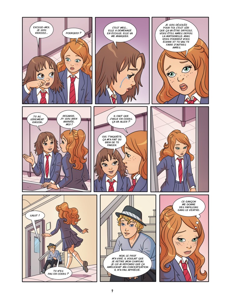 Cathy Cassidy est l’auteure d’une série de romans phénomènes qui a su rencontrer son public de lectrice adolescente. Impossible de faire un tour en librairie au rayon jeunesse sans voir un tome des Filles au chocolat que cela soit « Coeur poivré », « Coeur cookie » ou « Coeur piment ». Pourquoi ne pas les adapter en bande dessinée? Les lectrices seront au rendez-vous. C’est le cas pour « Miss pain d’épices » avec l’adorable de Cannelle Brownies. Les adolescentes en vivent des aventures dans leur quotidien. C’est compliqué de trouver sa place quand on veut être à la fois comme les autres et affirmer son identité. Notre héroïne porte un prénom et nom non atypique. Elle est rousse avec des yeux bleu/vert. Impossible de passer inaperçu. Tout cela a engendré beaucoup de moquerie à l’école primaire ce qui l’a isolé des autres. Au collège, elle a décidé d’être plus standard afin d’être accepté. Faut-il renoncer à sa personnalité pour cela? Faut-il penser comme tout le monde et donc personne? Un dilemme dans lequel beaucoup de jeunes filles peuvent se reconnaître. En plus, il faut s’interroger sur le véritable sens de l’amitié. Peut-on tout dire à ces amis? Faut-il parler de ces émotions et de ses ressentis? A chaque lectrice de trouver la réponse la plus adaptée à elle. Véronique Grisseaux trouve le juste milieu entre le côté psychologique et péripéties humaines. Les fans ne seront pas déçus. Claudia Forcelloni de son côté offre un univers chaleureux, mignon et réconfortant à l’image de l’histoire. Un duo très complémentaire qui va ravir les demoiselles en quête d’identité.