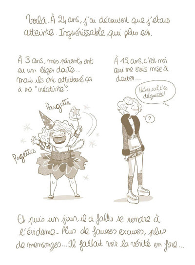 Il faut s’accepter même quand est quelqu’un d’un peu décalé. D’ailleurs, n’est-ce pas pour cela que nos amis nous aiment? Alors autant assumer son amour des paillettes, des couleurs, de l’exubérance. Ce n’est pas ce que fait tout le monde. Tant pis pour eux. Diglee assume son grain de folie et a décidé de le partager dans sa bande dessinée très personnelle. Ainsi nous sommes à ces côtés dans ces interrogations sur son célibat, sa passion pour son adorable félin, ses fantasmes autour d’Eric Northman, le méchant vampire dans « True blood » ou encore son admiration pour Julien Doré. A côté des cours, il ne faut pas oublier ce qui met du baume au cœur comme passer du temps avec notre famille, nos amies et nos potes. Forcément dans ces moments, il se passe toujours des choses improbables comme le pote qui ne sait pas tenir sa langue « elle adore se faire biffler » ou qui lui fait remarquer qu’elle n’a pas changé de tenue en deux jours. Des moments de honte qui au final prête à rire. Le quotidien est rempli de surprises qui mettent du piment dans la vie.